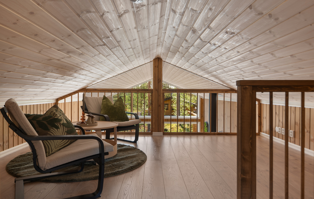 - Kronotex Mammut Oak Beige parkettlaminat på gulv, furupanel skygge skrå med fargen Stemning, hvitmalte profilerte lister og utforinger, hvitlasert skygge skrå panel i tak. Friskluftsventil.