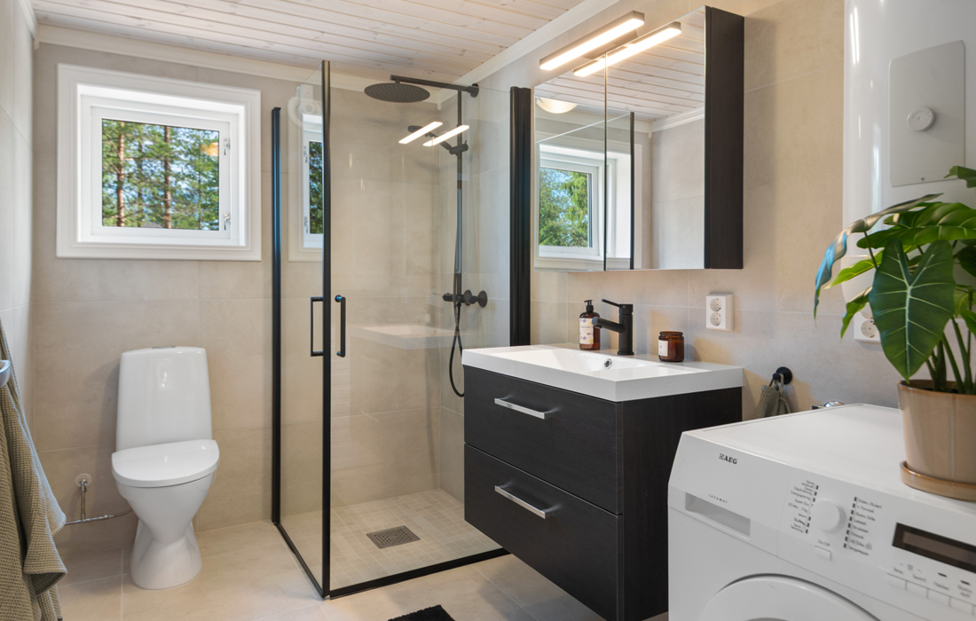 - Svarte armaturer og dusjkran. Svart avtrekksvifte og svarte brytere og stikkontakt,